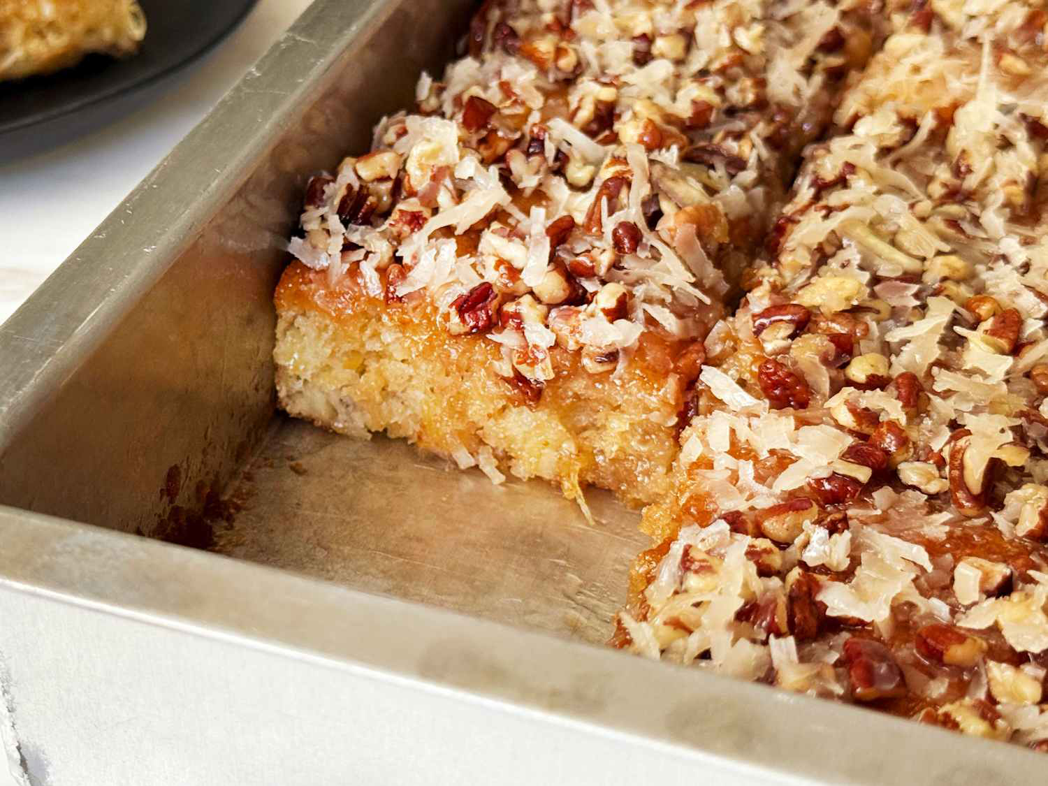 Remove mixture from heat and stir in pecans and coconut. Immediately pour over cake and let sink in. Broil for a minute or two to caramelize coconut. Let cool and serve.