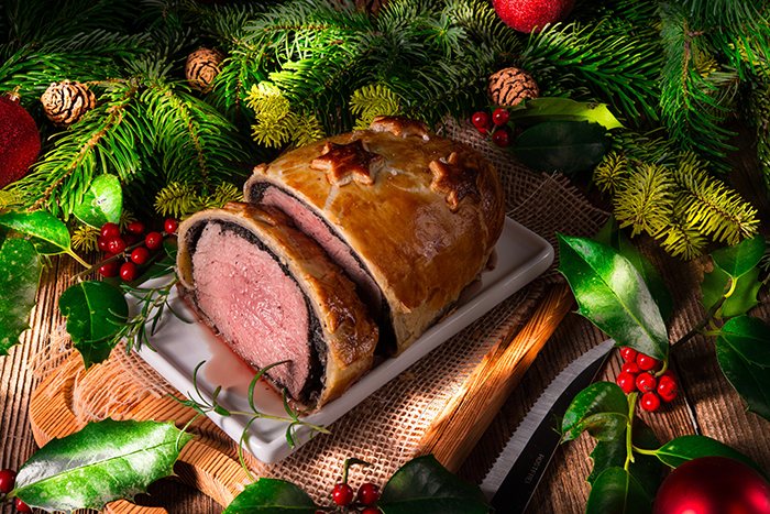 On a lightly floured surface roll out the puff pastry to form a rectangle large enough to completely encompass the prosciutto wrapped beef. Get your beaten egg ready. Remove the plastic from the beef and set it in the middle of the pastry. Fold the longer sies over the meat and brush the edges with the egg to seal. Brush the ends with the egg and fold over to completely seal the beef. Top with coarse salt and place seam-side down on a rimmed baking sheet.